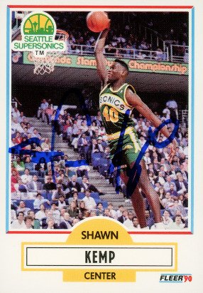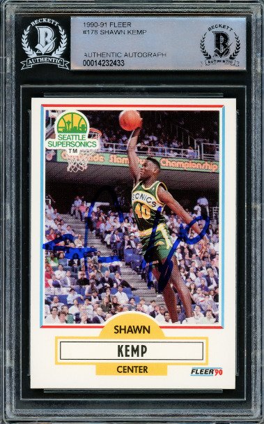 This Fleer Card showcases Shawn Kemp from his 1990 season. It is hand signed with a blue marker by Shawn Kemp and is graded by Beckett, grading its condition and autograph authenticity.