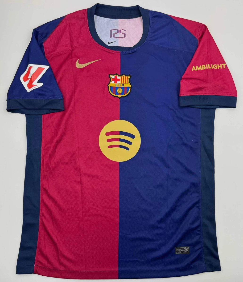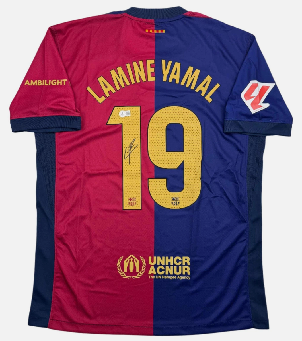 The product is a signed FC Barcelona Lamine Yamal soccer jersey. This original autographed jersey features the signature of Lamine Yamal, making it a valuable collectible for fans of soccer and FC Barcelona. The jersey is a unique piece of memorabilia that showcases the player’s authenticity and connection to the team.