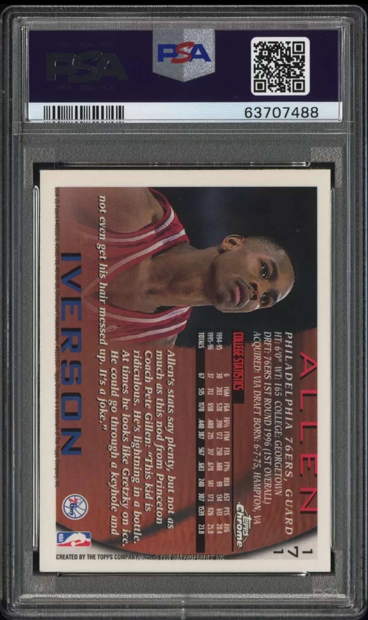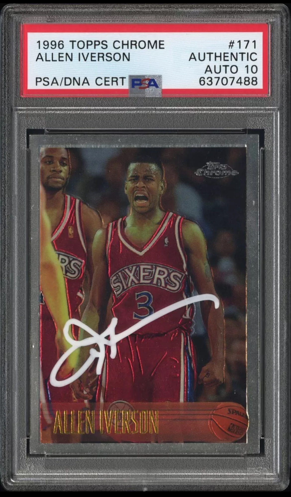 This Topps Chrome Rookie Card showcases Alen Iverson from his 1996 rookie season. It is signed with a white marker by Iverson and is graded by PSA with a rating of 10, grading its condition and autograph authenticity.